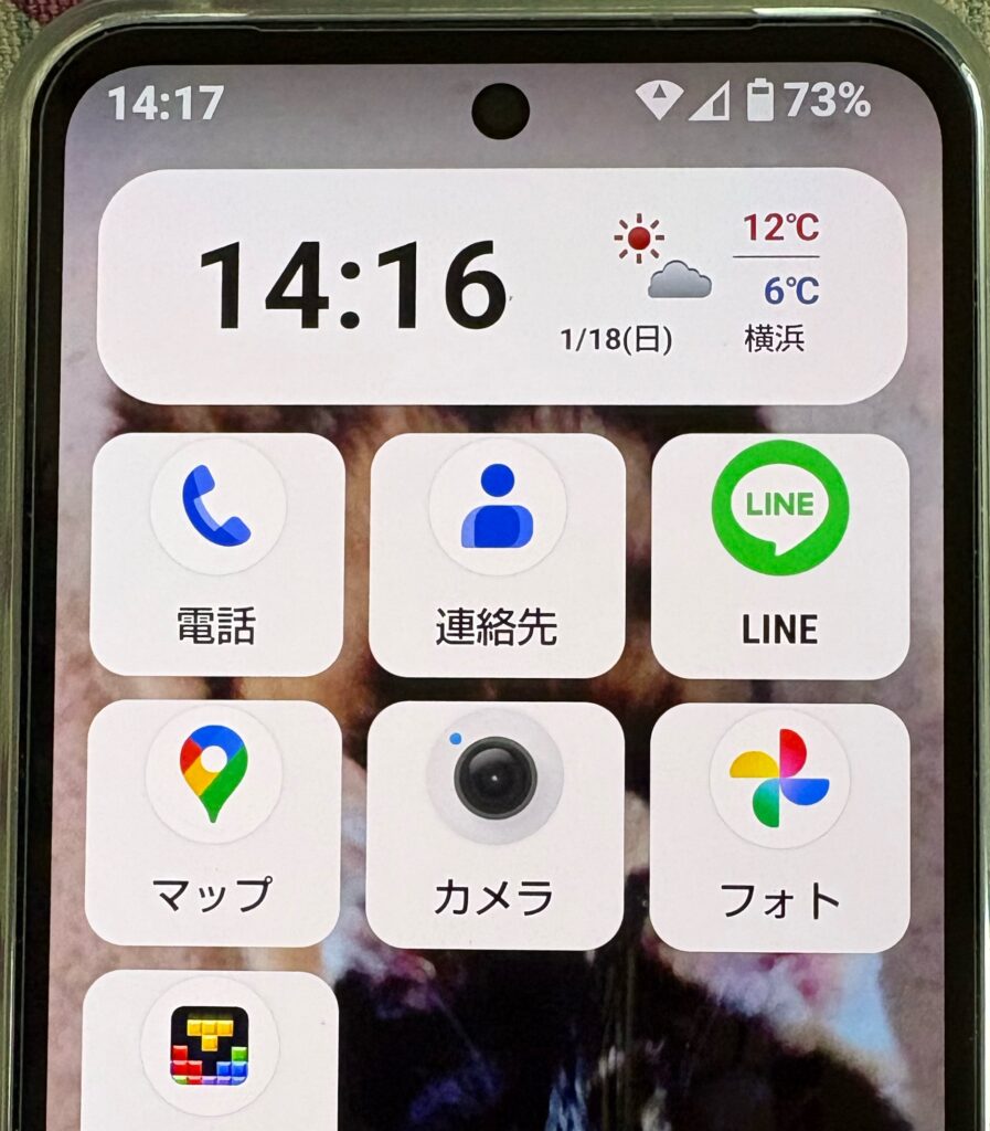 ホーム画面には、電話・電話帳・LINE・マップ・カメラ・フォト・パズルゲームのみです。